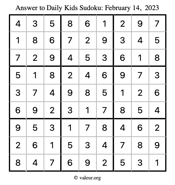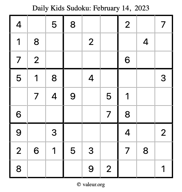 Here is the February 14, 2023 kids sudoku puzzle. You are welcome to print a copy to solve by hand. For your convenience, we have also included the solution further down the page so you can check your work.