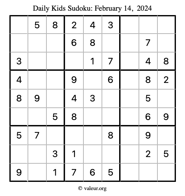 Kids Sudoku February 14, 2024 is not the only sudoku puzzle we have. We create a new kids sudoku puzzle every day for you to print and solve. Check out today's kids sudoku puzzle here!