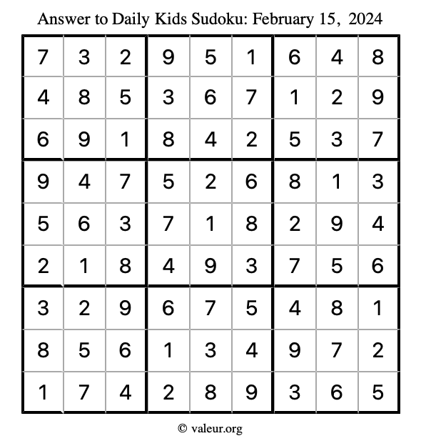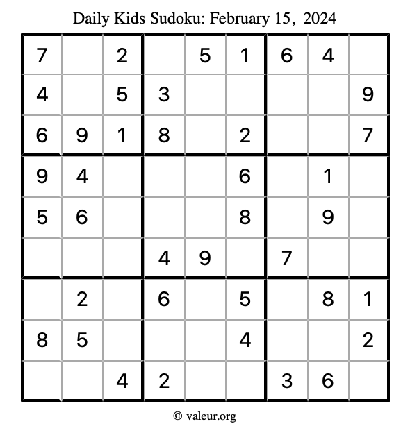 Here is the February 15, 2024 kids sudoku puzzle. You are welcome to print a copy to solve by hand. For your convenience, we have also included the solution further down the page so you can check your work.