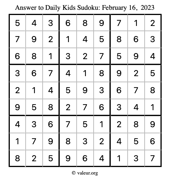 Here is the February 16, 2023 kids sudoku puzzle. You are welcome to print a copy to solve by hand. For your convenience, we have also included the solution further down the page so you can check your work.