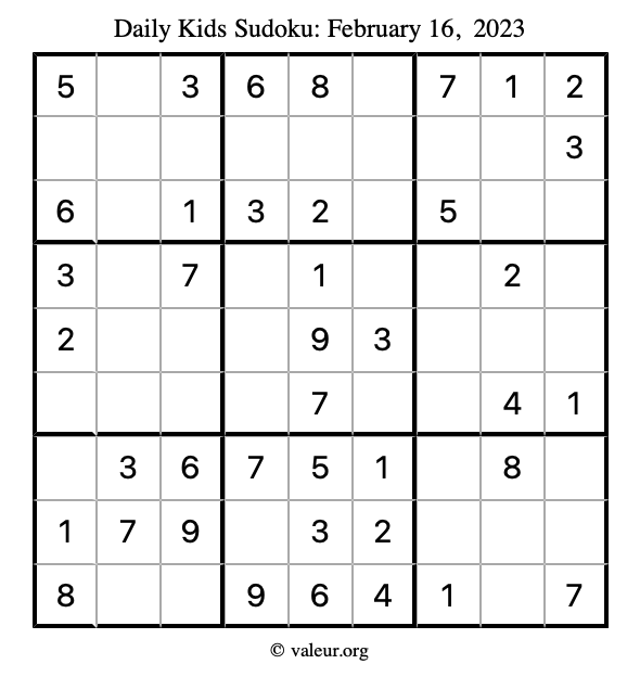 Kids Sudoku February 16, 2023 is not the only sudoku puzzle we have. We create a new kids sudoku puzzle every day for you to print and solve. Check out today's kids sudoku puzzle here!