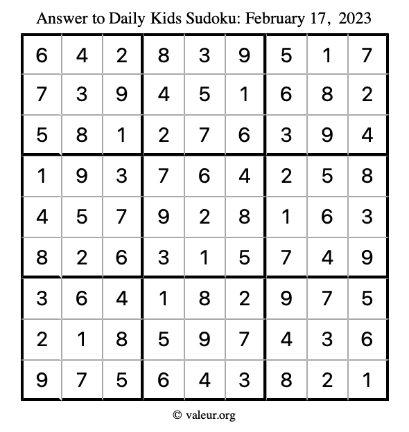 Here is the February 17, 2023 kids sudoku puzzle. You are welcome to print a copy to solve by hand. For your convenience, we have also included the solution further down the page so you can check your work.