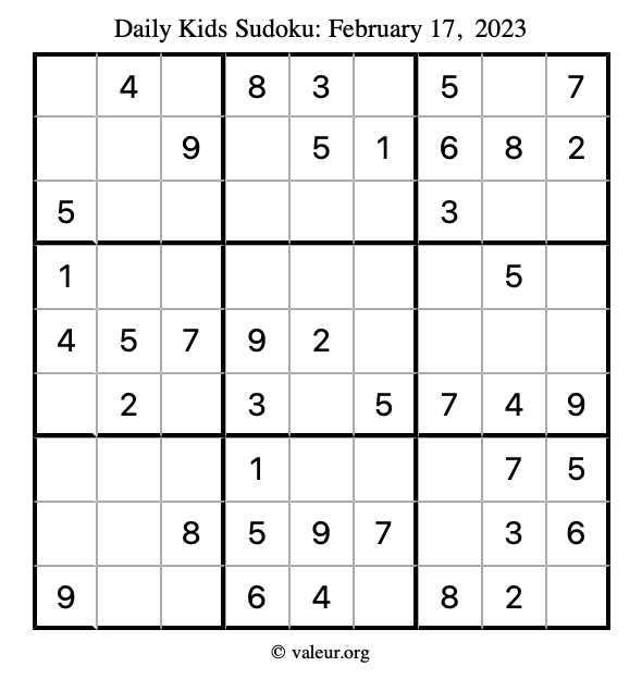 Kids Sudoku February 17, 2023 is not the only sudoku puzzle we have. We create a new kids sudoku puzzle every day for you to print and solve. Check out today's kids sudoku puzzle here!