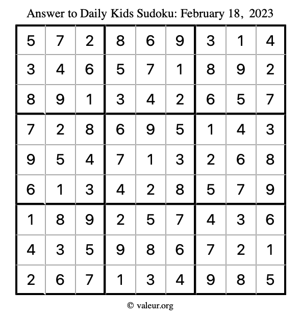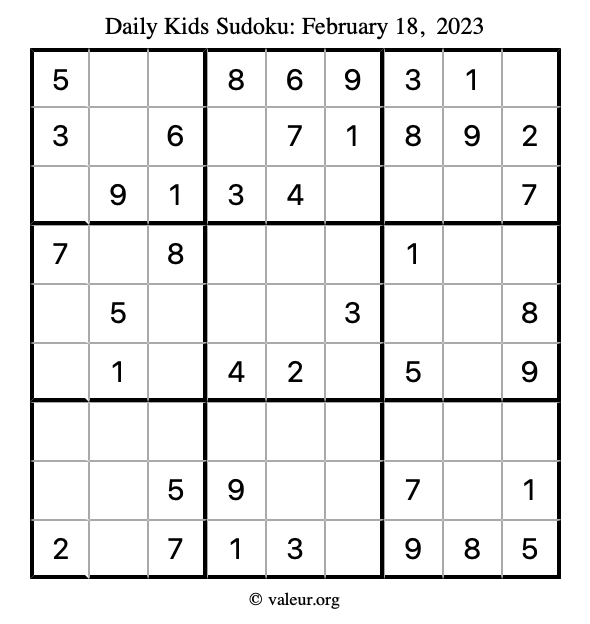 Kids Sudoku February 18, 2023 is not the only sudoku puzzle we have. We create a new kids sudoku puzzle every day for you to print and solve. Check out today's kids sudoku puzzle here!