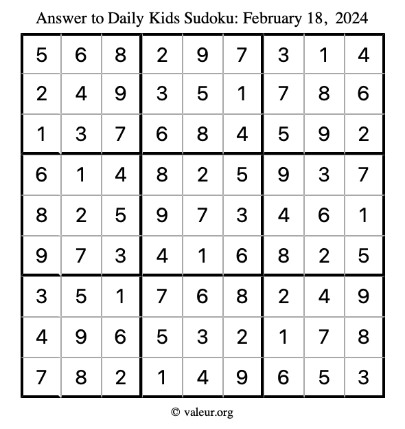 Here is the February 18, 2024 kids sudoku puzzle. You are welcome to print a copy to solve by hand. For your convenience, we have also included the solution further down the page so you can check your work.