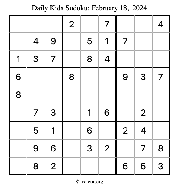 Kids Sudoku February 18, 2024 is not the only sudoku puzzle we have. We create a new kids sudoku puzzle every day for you to print and solve. Check out today's kids sudoku puzzle here!