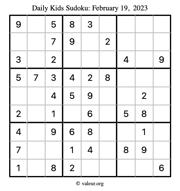 Kids Sudoku February 19, 2023 is not the only sudoku puzzle we have. We create a new kids sudoku puzzle every day for you to print and solve. Check out today's kids sudoku puzzle here!