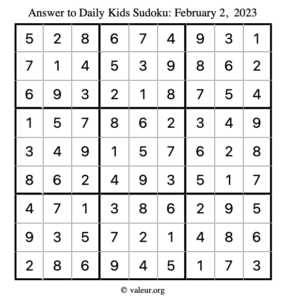 Here is the February 2, 2023 kids sudoku puzzle. You are welcome to print a copy to solve by hand. For your convenience, we have also included the solution further down the page so you can check your work.