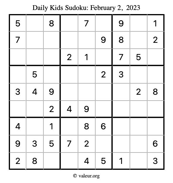 Kids Sudoku February 2, 2023 is not the only sudoku puzzle we have. We create a new kids sudoku puzzle every day for you to print and solve. Check out today's kids sudoku puzzle here!