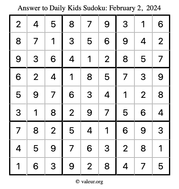 Here is the February 2, 2024 kids sudoku puzzle. You are welcome to print a copy to solve by hand. For your convenience, we have also included the solution further down the page so you can check your work.