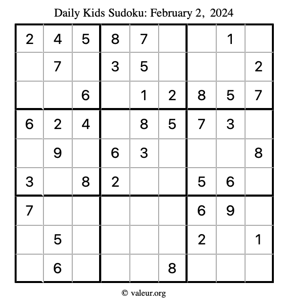 Kids Sudoku February 2, 2024 is not the only sudoku puzzle we have. We create a new kids sudoku puzzle every day for you to print and solve. Check out today's kids sudoku puzzle here!
