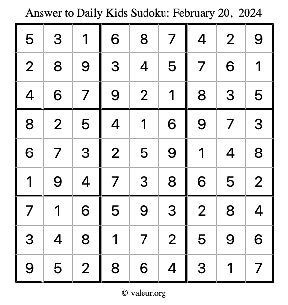 Here is the February 20, 2024 kids sudoku puzzle. You are welcome to print a copy to solve by hand. For your convenience, we have also included the solution further down the page so you can check your work.