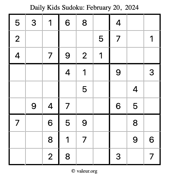 Kids Sudoku February 20, 2024 is not the only sudoku puzzle we have. We create a new kids sudoku puzzle every day for you to print and solve. Check out today's kids sudoku puzzle here!