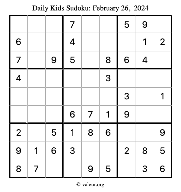 Kids Sudoku February 26, 2024 is not the only sudoku puzzle we have. We create a new kids sudoku puzzle every day for you to print and solve. Check out today's kids sudoku puzzle here!