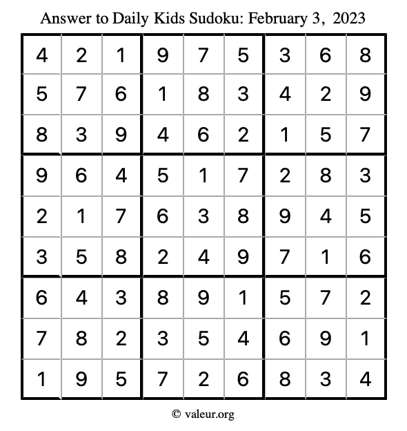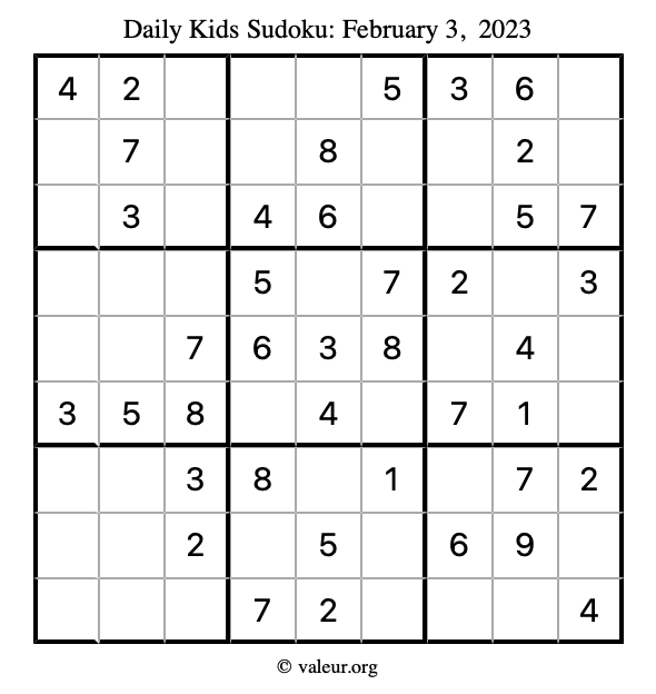 Kids Sudoku February 3, 2023 is not the only sudoku puzzle we have. We create a new kids sudoku puzzle every day for you to print and solve. Check out today's kids sudoku puzzle here!