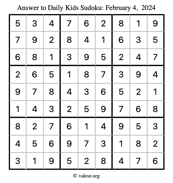 Here is the February 4, 2024 kids sudoku puzzle. You are welcome to print a copy to solve by hand. For your convenience, we have also included the solution further down the page so you can check your work.
