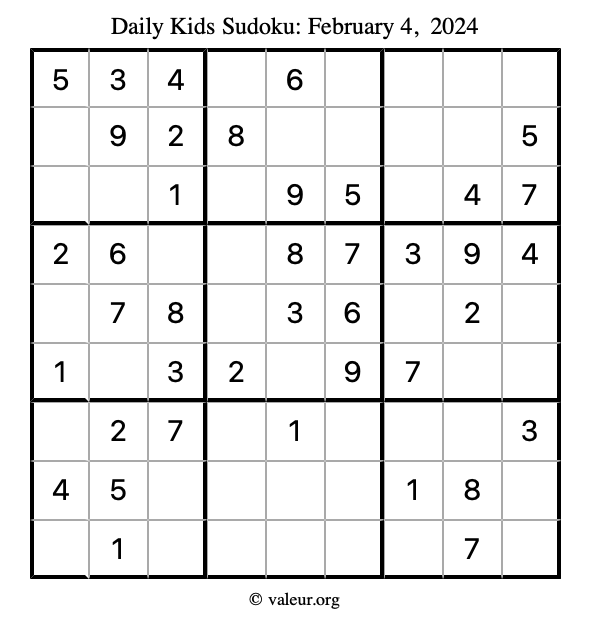 Kids Sudoku February 4, 2024 is not the only sudoku puzzle we have. We create a new kids sudoku puzzle every day for you to print and solve. Check out today's kids sudoku puzzle here!