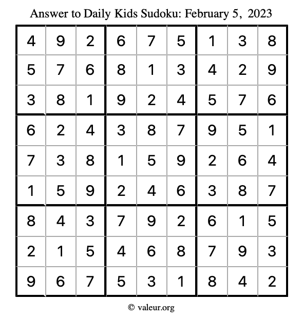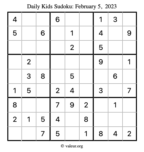 Kids Sudoku February 5, 2023 is not the only sudoku puzzle we have. We create a new kids sudoku puzzle every day for you to print and solve. Check out today's kids sudoku puzzle here!