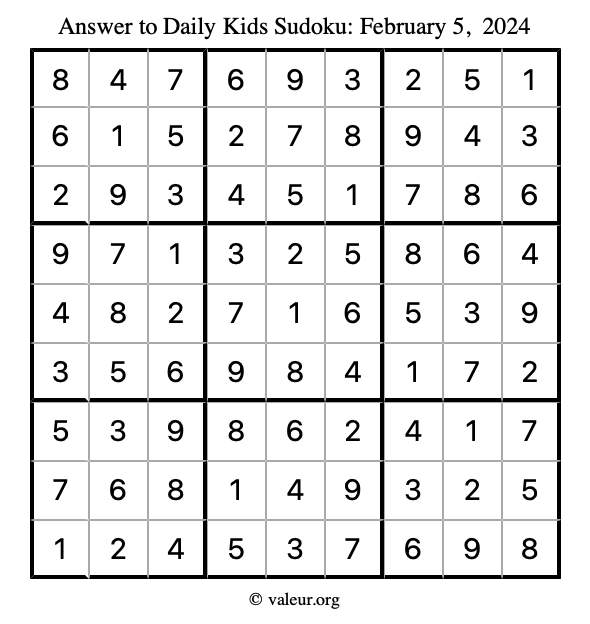 Here is the February 5, 2024 kids sudoku puzzle. You are welcome to print a copy to solve by hand. For your convenience, we have also included the solution further down the page so you can check your work.