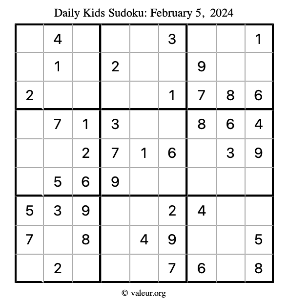 Kids Sudoku February 5, 2024 is not the only sudoku puzzle we have. We create a new kids sudoku puzzle every day for you to print and solve. Check out today's kids sudoku puzzle here!