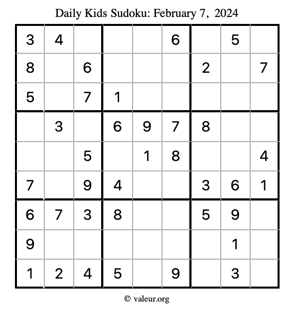 Kids Sudoku February 7, 2024 is not the only sudoku puzzle we have. We create a new kids sudoku puzzle every day for you to print and solve. Check out today's kids sudoku puzzle here!