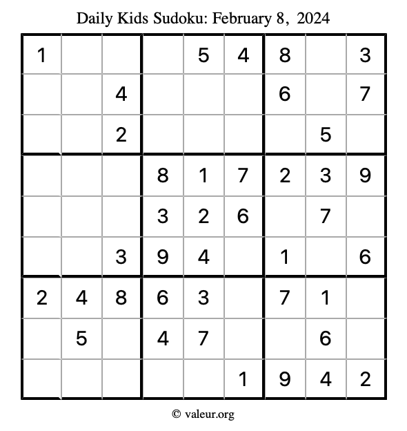 Here is the February 8, 2024 kids sudoku puzzle. You are welcome to print a copy to solve by hand. For your convenience, we have also included the solution further down the page so you can check your work.