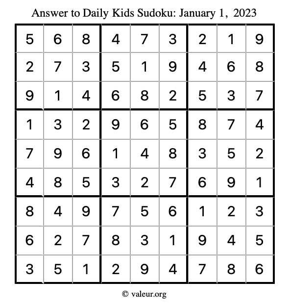 Here is the January 1, 2023 kids sudoku puzzle. You are welcome to print a copy to solve by hand. For your convenience, we have also included the solution further down the page so you can check your work.