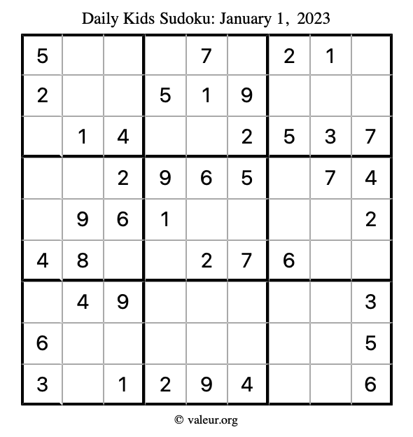 Kids Sudoku January 1, 2023 is not the only sudoku puzzle we have. We create a new kids sudoku puzzle every day for you to print and solve. Check out today's kids sudoku puzzle here!