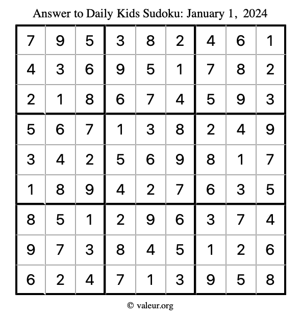 Here is the January 1, 2024 kids sudoku puzzle. You are welcome to print a copy to solve by hand. For your convenience, we have also included the solution further down the page so you can check your work.