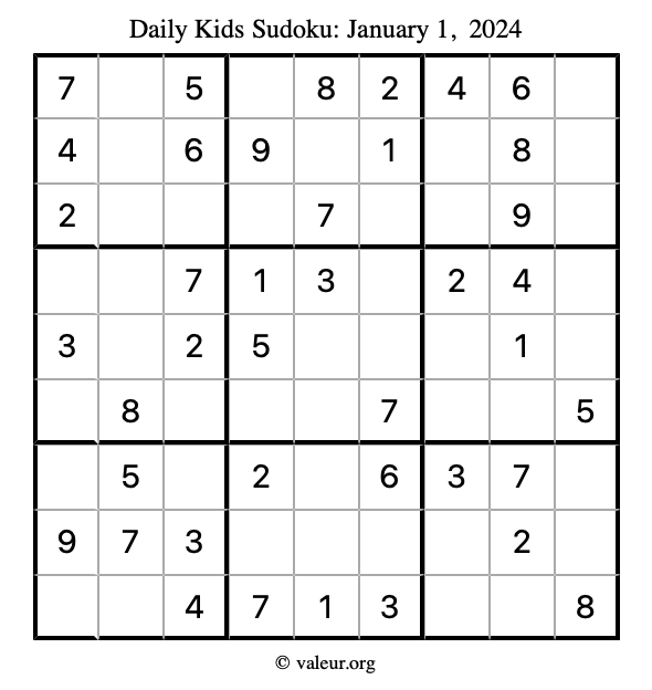 Kids Sudoku January 1, 2024 is not the only sudoku puzzle we have. We create a new kids sudoku puzzle every day for you to print and solve. Check out today's kids sudoku puzzle here!