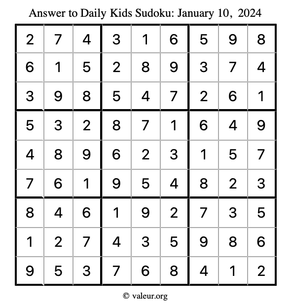 Here is the January 10, 2024 kids sudoku puzzle. You are welcome to print a copy to solve by hand. For your convenience, we have also included the solution further down the page so you can check your work.