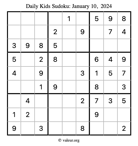 Kids Sudoku January 10, 2024 is not the only sudoku puzzle we have. We create a new kids sudoku puzzle every day for you to print and solve. Check out today's kids sudoku puzzle here!