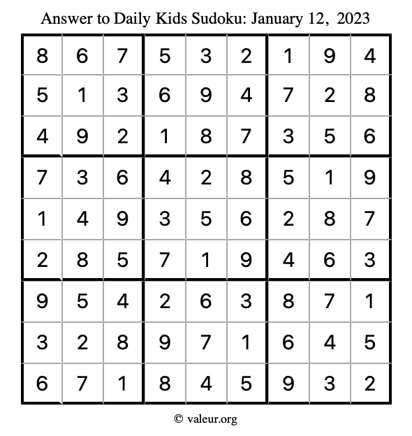 Here is the January 12, 2023 kids sudoku puzzle. You are welcome to print a copy to solve by hand. For your convenience, we have also included the solution further down the page so you can check your work.