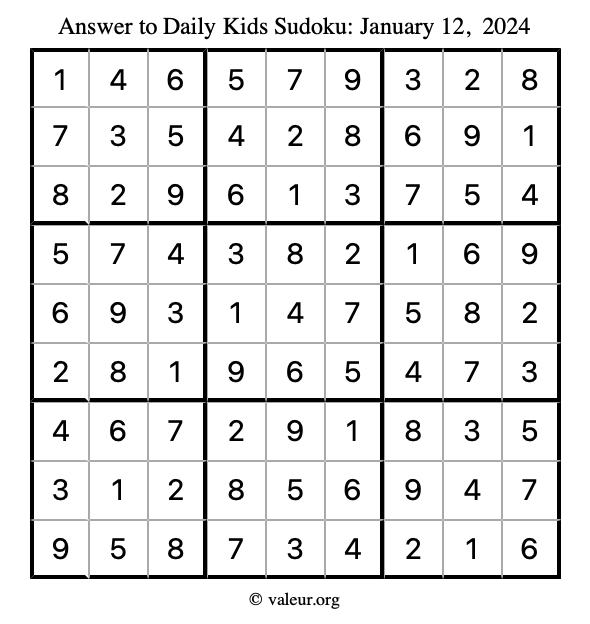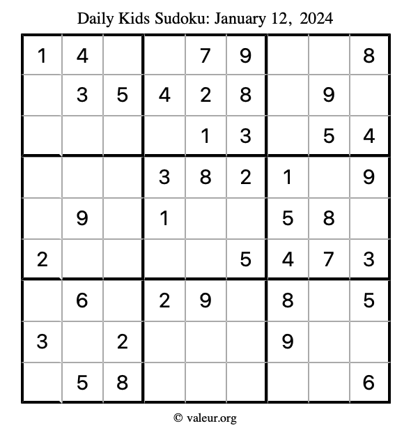 Kids Sudoku January 12, 2024 is not the only sudoku puzzle we have. We create a new kids sudoku puzzle every day for you to print and solve. Check out today's kids sudoku puzzle here!
