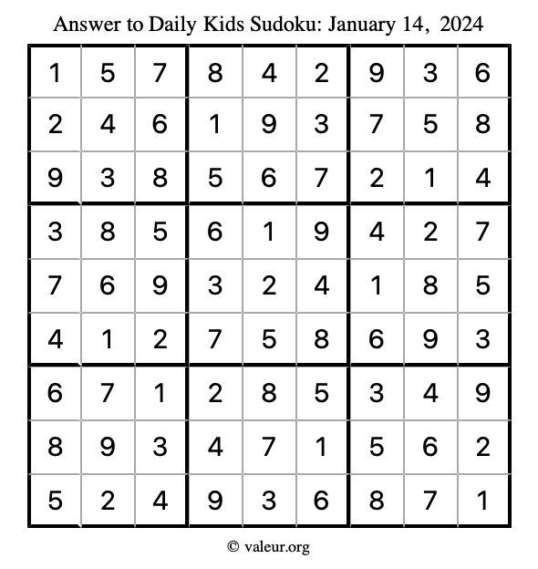 Here is the January 14, 2024 kids sudoku puzzle. You are welcome to print a copy to solve by hand. For your convenience, we have also included the solution further down the page so you can check your work.