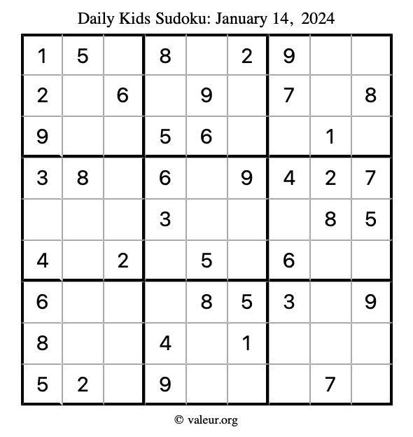 Kids Sudoku January 14, 2024 is not the only sudoku puzzle we have. We create a new kids sudoku puzzle every day for you to print and solve. Check out today's kids sudoku puzzle here!