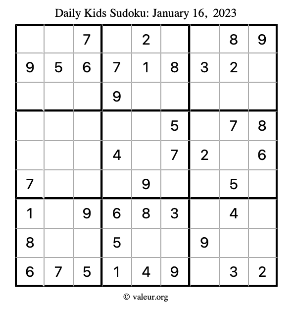 Kids Sudoku January 16, 2023 is not the only sudoku puzzle we have. We create a new kids sudoku puzzle every day for you to print and solve. Check out today's kids sudoku puzzle here!