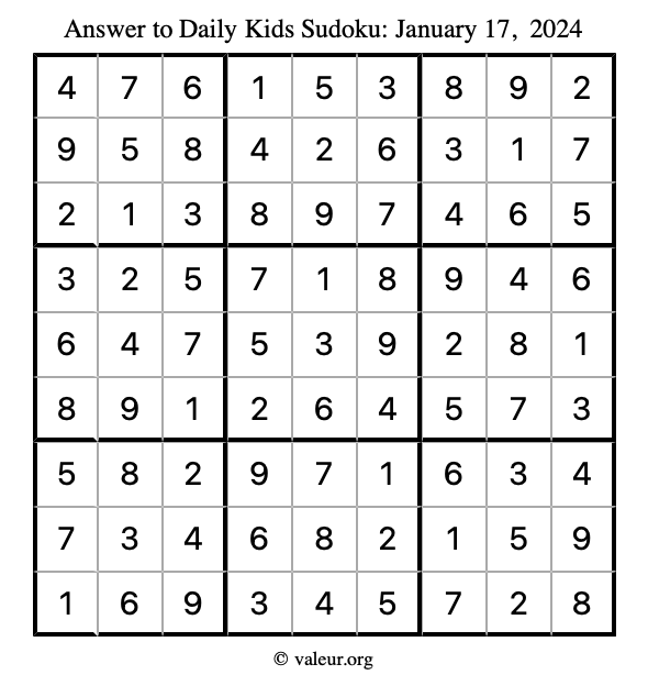 Here is the January 17, 2024 kids sudoku puzzle. You are welcome to print a copy to solve by hand. For your convenience, we have also included the solution further down the page so you can check your work.