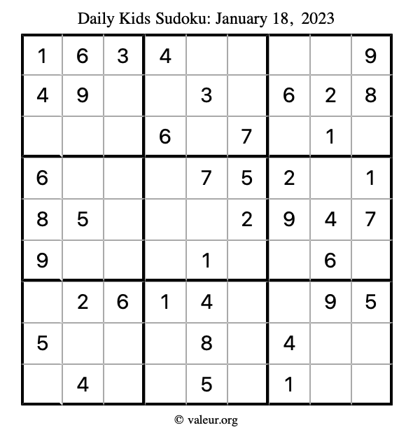 Kids Sudoku January 18, 2023 is not the only sudoku puzzle we have. We create a new kids sudoku puzzle every day for you to print and solve. Check out today's kids sudoku puzzle here!
