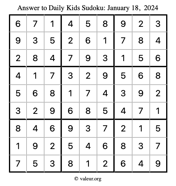 Here is the January 18, 2024 kids sudoku puzzle. You are welcome to print a copy to solve by hand. For your convenience, we have also included the solution further down the page so you can check your work.