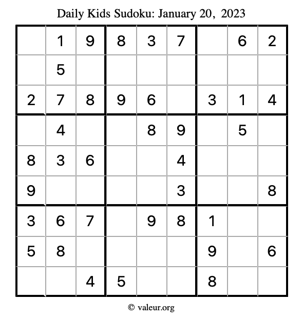 Kids Sudoku January 20, 2023 is not the only sudoku puzzle we have. We create a new kids sudoku puzzle every day for you to print and solve. Check out today's kids sudoku puzzle here!