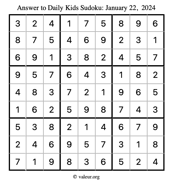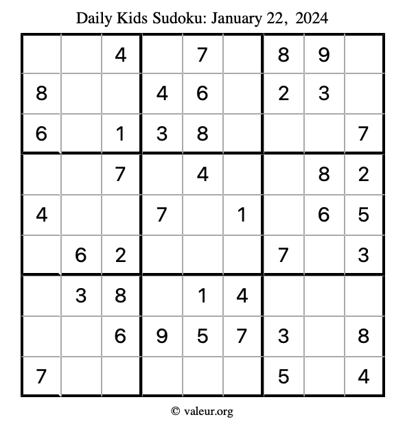 Here is the January 22, 2024 kids sudoku puzzle. You are welcome to print a copy to solve by hand. For your convenience, we have also included the solution further down the page so you can check your work.