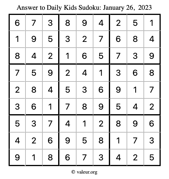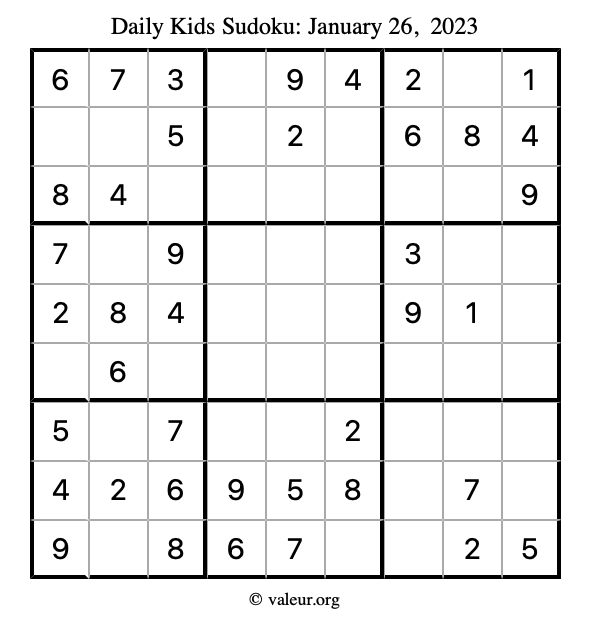 Here is the January 26, 2023 kids sudoku puzzle. You are welcome to print a copy to solve by hand. For your convenience, we have also included the solution further down the page so you can check your work.