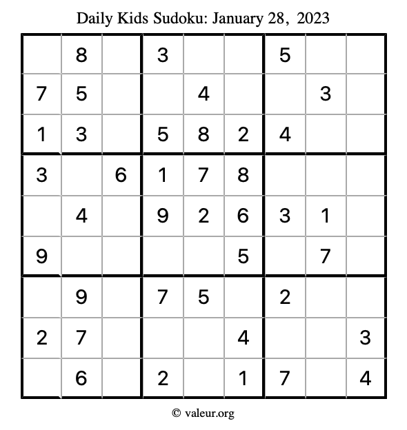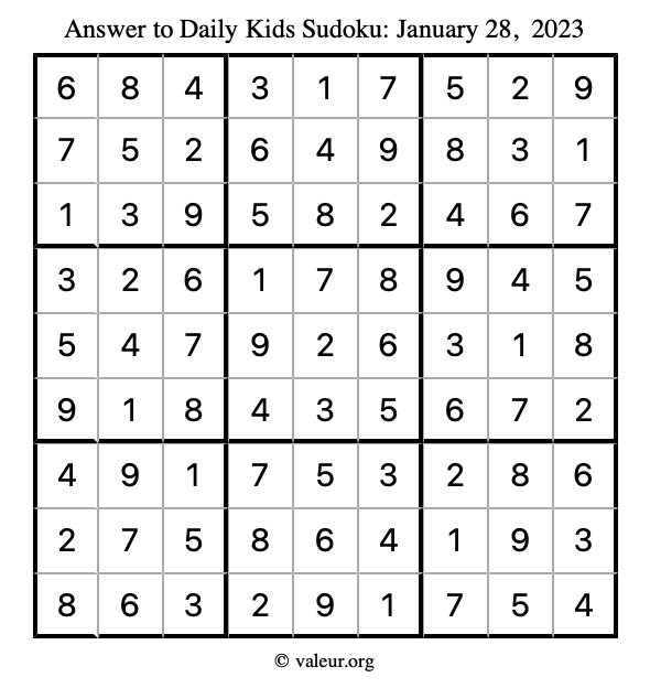 Here is the January 28, 2023 kids sudoku puzzle. You are welcome to print a copy to solve by hand. For your convenience, we have also included the solution further down the page so you can check your work.