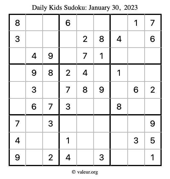 Kids Sudoku January 30, 2023 is not the only sudoku puzzle we have. We create a new kids sudoku puzzle every day for you to print and solve. Check out today's kids sudoku puzzle here!