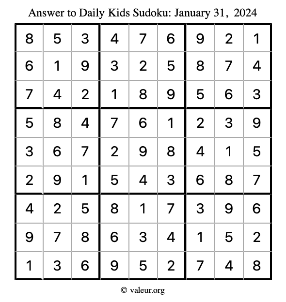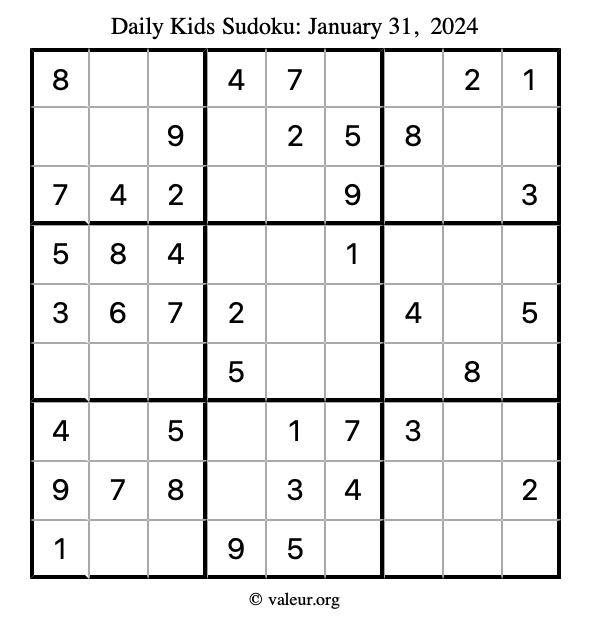 Kids Sudoku January 31, 2024 is not the only sudoku puzzle we have. We create a new kids sudoku puzzle every day for you to print and solve. Check out today's kids sudoku puzzle here!