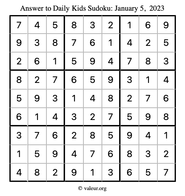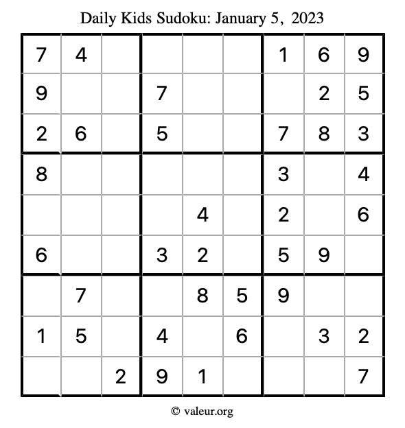 Kids Sudoku January 5, 2023 is not the only sudoku puzzle we have. We create a new kids sudoku puzzle every day for you to print and solve. Check out today's kids sudoku puzzle here!