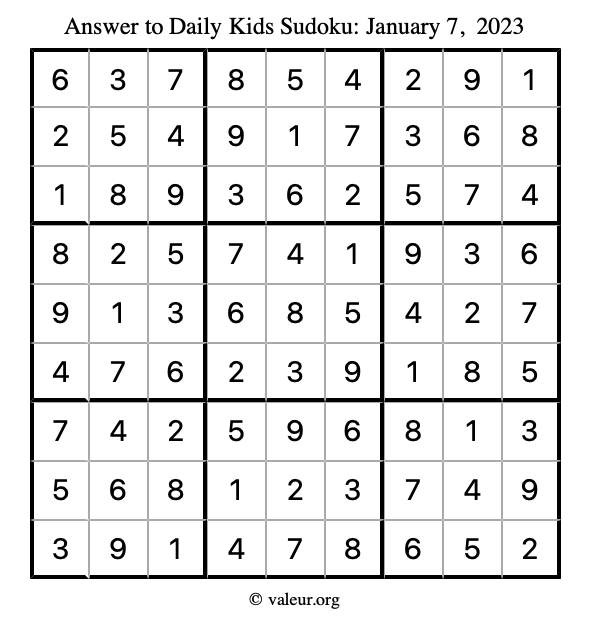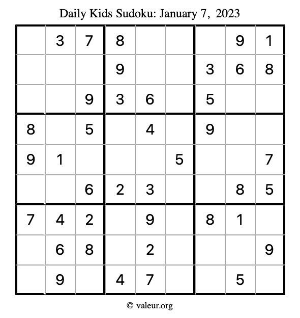 Kids Sudoku January 7, 2023 is not the only sudoku puzzle we have. We create a new kids sudoku puzzle every day for you to print and solve. Check out today's kids sudoku puzzle here!