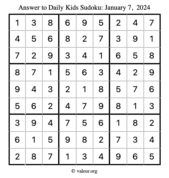 Here is the January 7, 2024 kids sudoku puzzle. You are welcome to print a copy to solve by hand. For your convenience, we have also included the solution further down the page so you can check your work.
