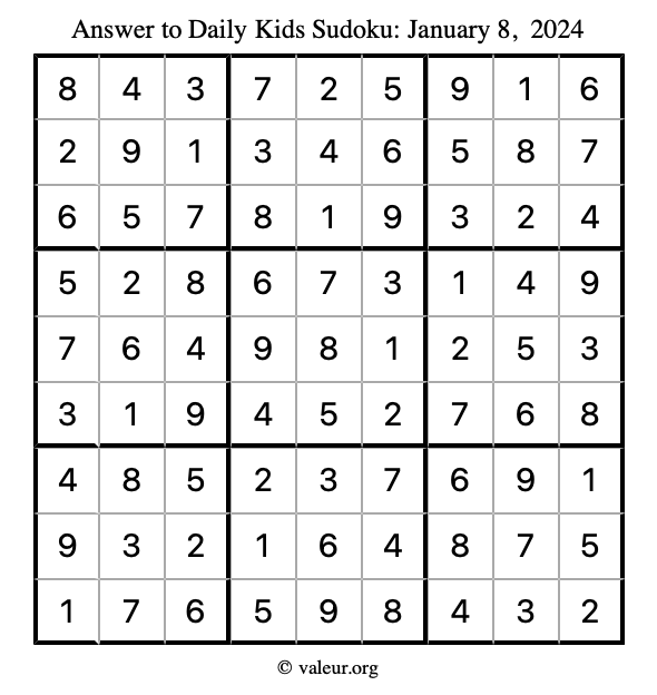 Here is the January 8, 2024 kids sudoku puzzle. You are welcome to print a copy to solve by hand. For your convenience, we have also included the solution further down the page so you can check your work.